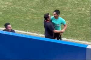 現(xiàn)場實(shí)拍視頻顯示,馬寧準(zhǔn)備向云南隊(duì)替補(bǔ)席的人員出示黃牌,隨后見到被出示黃牌的人員繼續(xù)抗議裁判,迅速跑到場邊。云南隊(duì)主教練立即試圖拉住馬寧,但馬寧最終還是出示紅牌將云南替補(bǔ)席上的工作人員紅牌罰下。