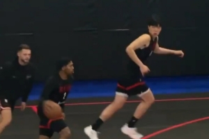 視頻當中,楊瀚森接球上籃打進,開拓者眾將輕松備戰(zhàn)氛圍融洽。