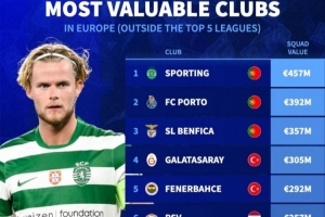 體育資訊11月11日訊 德國轉會市場盤點了五大聯(lián)賽之外的歐洲球隊身價,葡萄牙體育4.57億歐元排名第一。