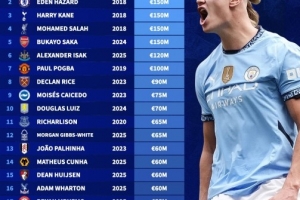 體育資訊11月12日訊 德國轉(zhuǎn)會市場盤點了英超各隊歷史身價最高球員,哈蘭德以2億歐居首,阿扎爾、凱恩、薩拉赫和薩卡均為1.5億歐。