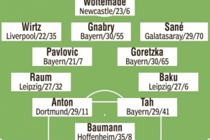 中場:帕夫洛維奇(拜仁)、格雷茨卡(拜仁)、維爾茨(利物浦)、格納布里(拜仁)、薩內(nèi)(加拉塔薩雷)