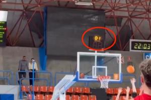 畫面中,當(dāng)時比賽還剩下0.8秒,余嘉豪所在球隊落后對手一分,他接應(yīng)隊友邊線傳球,轉(zhuǎn)身拋射壓哨打進,卻被裁判吹掉。