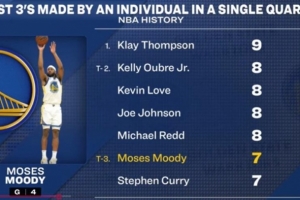 據(jù)統(tǒng)計(jì),穆迪單節(jié)7記三分,與庫(kù)里并列歷史第三多,NBA歷史單節(jié)三分紀(jì)錄由克萊保持(9記)。