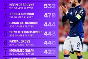 2、德布勞內(nèi):176場創(chuàng)造532次機會