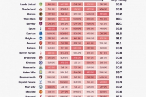 OPTA為各隊(duì)未來5輪聯(lián)賽的困難程度進(jìn)行了量化打分,利茲聯(lián)賽程95.0分最困難,桑德蘭(93.6分)、狼隊(duì)(93.2分)、西漢姆(93.1分)、伯恩利(92.1分)分列二到五位。