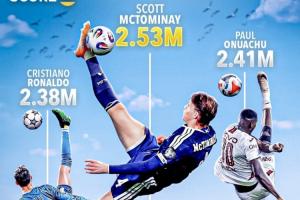 麥克托米奈倒鉤時的腳尖高度為2.53米,此前奧努阿楚的紀(jì)錄為2.41米,而C羅的紀(jì)錄為2.38米。
