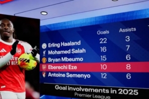 全文摘要:英超第12輪,埃澤戴帽助阿森納4-1大勝熱刺。BBC數(shù)據(jù)顯示,他本賽季英超已參與18球,進(jìn)球數(shù)僅次于哈蘭德、薩拉赫和姆伯莫,與塞梅尼奧并列第四。