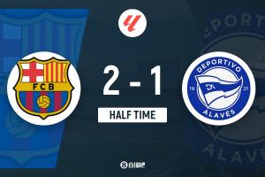 上半場(chǎng)補(bǔ)時(shí)4分鐘,巴薩2-1阿拉維斯。