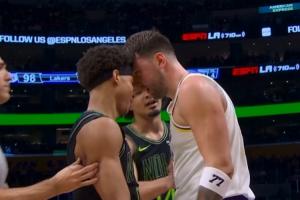 東契奇被鵜鶘新秀費(fèi)爾斯犯規(guī),很生氣,和對(duì)手頂牛