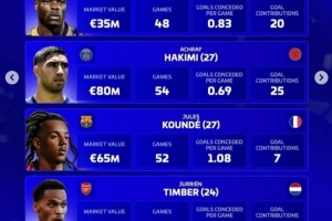 全文摘要:《轉會市場》評2025最佳右后衛(wèi)候選:鄧弗里斯(國米)、阿什拉夫(巴黎)、孔德(巴薩)、廷伯(阿森納)。數(shù)據(jù)對比顯示,阿什拉夫身價最高(8000萬歐),參與進球最多(25球);廷伯場均丟球最少(0.63球);鄧弗里斯直接參與20球;孔de參與進球最少(7球)。四人表現(xiàn)各具優(yōu)勢。