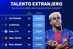 身價(jià)前十俱樂部外籍球員占比排名: