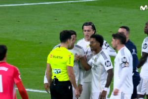 比賽補(bǔ)時(shí)階段,主裁金特羅·岡薩雷斯先是向抗議的卡雷拉斯出示黃牌,隨后又直紅將其罰下場(chǎng),多名皇馬球員立即圍向裁判抗議。