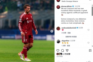 本場(chǎng)比賽麥卡利斯特表現(xiàn)不俗,他也在個(gè)人社媒曬出本場(chǎng)照片,配文寫(xiě)道:“我們是利物浦,我們值得這樣的時(shí)刻。對(duì)陣強(qiáng)敵取得了一場(chǎng)很棒的勝利!”