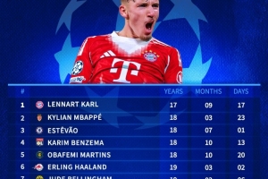 體育資訊12月10日訊 在本輪歐冠拜仁3-1擊敗葡體的比賽中,卡爾破門,也成為歐冠最年輕連續(xù)3場(chǎng)進(jìn)球球員。以下為自92/93賽季歐冠改制以來最年輕連續(xù)3場(chǎng)破門紀(jì)錄榜: