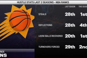 太陽搶斷本賽季聯(lián)盟第1&上賽季第28 活球爭(zhēng)搶本季第1&上賽季第20