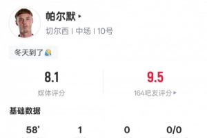 全文摘要:切爾西1-0埃弗頓,帕爾默建功。他在英超第16輪表現(xiàn)亮眼,1次射門(mén)即破門(mén),并送出2次關(guān)鍵傳球,獲評(píng)8.1分。全場(chǎng)比賽觸球37次,傳球成功率近八成,展現(xiàn)出出色的進(jìn)攻組織能力。