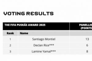 根據(jù)國(guó)際足聯(lián)官方公布的票數(shù)統(tǒng)計(jì)結(jié)果,蒙鐵爾以21分位列第一,賴斯和亞馬爾同積17分分列二三,官方僅給出了前三名的投票結(jié)果。