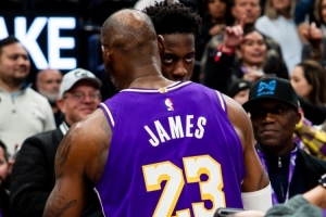 GIF-詹姆斯昨天賽后第一時間和場邊觀戰(zhàn)的25年狀元大熱AJ·迪班薩擁抱耳語