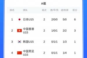 A組積分榜,日本U15兩連勝進(jìn)5球0失球小組第一,中國香港U15兩場1勝1負(fù)第二,韓國U15兩場1負(fù)1平第三,國少兩場1負(fù)1平進(jìn)1球丟4球繼續(xù)墊底。