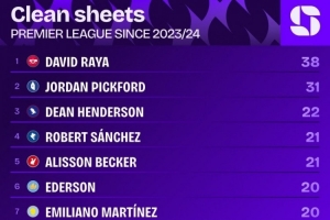 本場(chǎng)過后,從23-24賽季算起(注:拉亞在2023年夏天加盟阿森納),拉亞在英超比賽中已38次零封對(duì)手,該統(tǒng)計(jì)數(shù)據(jù)排在同期英超各隊(duì)門將榜首(排在第2、第3位的分別是皮克福德,迪恩-亨德森)。