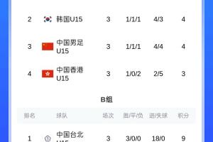 積分榜方面,U15中國(guó)隊(duì)與韓國(guó)U15同積4分,相互戰(zhàn)績(jī)一致,小組凈勝球落后對(duì)手1球,最終排名第三收官。