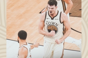 賽后勇士官方曬出贏球海報(bào),封面為庫(kù)里+波斯特慶祝的一幕。