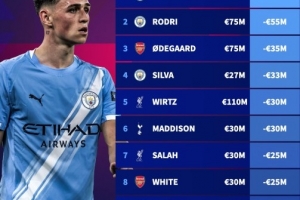 1、福登(曼城,8000萬(wàn)歐):-6000萬(wàn)歐