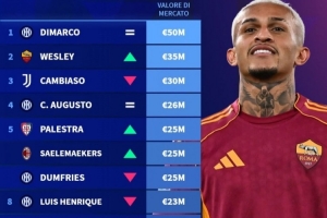 體育資訊12月25日訊 德轉本周更新了意甲最新身價,今日德轉曬出了意甲邊后衛(wèi)的身價TOP10榜單,迪馬爾科5000萬歐繼續(xù)排在第一,羅馬右后衛(wèi)韋斯利升至3500萬歐超越坎比亞索來到第二位。