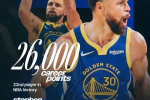 庫(kù)里成為了歷史第22位得分破兩萬(wàn)六的球員,排在他身前的是加內(nèi)特的26071。