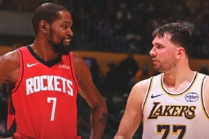 賽后火箭官推發(fā)布贏球海報(bào),杜蘭特和東契奇對視瞬間成為封面。