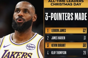 隨著今天比賽中詹姆斯投進(jìn)一記三分,他生涯圣誕大戰(zhàn)三分命中數(shù)達(dá)到32記,超越哈登(31記),獨(dú)占圣誕大戰(zhàn)歷史三分王。而杜蘭特今天命中4記三分,升到了第三位。賈馬爾·穆雷(今天命中9記)和霍福德的排名也有變化。而前十中,除了雷迪克,其余均為現(xiàn)役球員。
