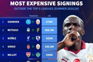 五大聯(lián)賽之外球隊(duì)今夏最貴引援排名: