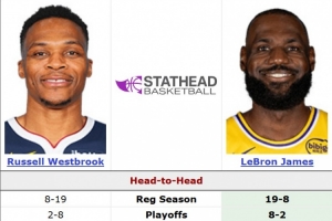 生涯至今,威少常規(guī)賽面對詹姆斯為8勝19負,季后賽為2勝8負。
