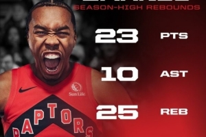 本場比賽巴恩斯17中11狂砍23分25籃板10助攻3搶斷1蓋帽,正負值+24。