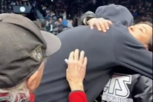 賽前,杜蘭特與籃網(wǎng)死忠老球迷Mr Whammy親切交流,并擁抱了蔡老板夫人吳明華。