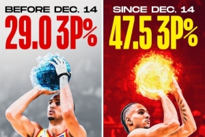 據(jù)統(tǒng)計(jì),在賽季開始至北京時(shí)間12月15日這段時(shí)間,他的三分命中率僅為29%。而在那之后的12月16日至今,他的三分命中率達(dá)到47.5%。