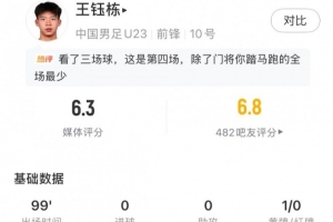 體育資訊1月17日訊 U23亞洲杯1/4決賽,國(guó)足vs烏茲別克斯坦,王鈺棟為U23國(guó)足首發(fā)出戰(zhàn),加時(shí)賽第9分鐘因體力耗盡被換下,最終獲評(píng)6.3分。