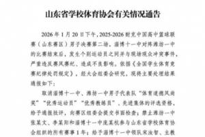 新華社濟(jì)南1月22日電(記者張武岳、韋驊)記者22日從山東省學(xué)校體育協(xié)會(huì)獲悉,針對(duì)20日在2025-2026耐克中國(guó)高中籃球聯(lián)賽基層賽(山東賽區(qū))男子決賽第二場(chǎng)淄博十一中隊(duì)和濰坊一中隊(duì)賽后發(fā)生的沖突事件,依據(jù)《全國(guó)學(xué)生體育競(jìng)賽紀(jì)律處罰規(guī)定》,大會(huì)組委會(huì)研究后,作出對(duì)部分球員禁賽、取消淄博十一中的比賽承辦資格等處罰決定。
