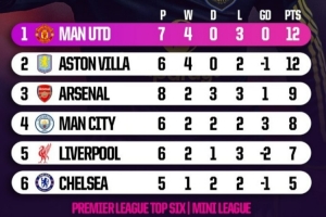 體育資訊1月26日訊 在本輪英超焦點戰(zhàn),曼聯(lián)3-2擊敗阿森納。OPTA也盤點了目前積分榜前六名相互之間交鋒戰(zhàn)績排名,具體如下: