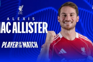 本場比賽麥卡利斯特梅開二度,賽后當(dāng)選歐冠官方評選出的本場最佳球員。