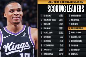這樣威少生涯總得分已經(jīng)超越奧拉朱旺,(26946分),歷史得分榜排名將上升至第14位。