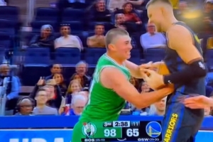 賽后采訪,完成勇士首秀的波爾津吉斯接受了記者采訪。談到自己和普理查德?lián)屒颍f道:“我不會(huì)輕易放棄那個(gè)球的。當(dāng)時(shí)我們落后很多,所以我的心情本來就不太好。但其實(shí)那只是和老隊(duì)友之間的一個(gè)有趣瞬間,只是開開玩笑而已?!?/p>