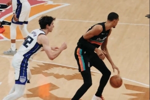 在本場(chǎng)比賽中,文班亞馬面對(duì)雷諾左手胯下運(yùn)球過人后接扣籃終結(jié)。