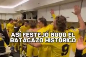 博德閃耀教練和球員賽后在更衣室慶祝晉級(jí),他們拍打桌子和更衣柜,以特有的方式慶祝,更衣室內(nèi)氣氛熱烈。