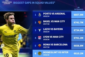 體育資訊2月25日訊 國米在本輪歐冠主場1-2不敵博德閃耀,兩回合總比分2-5被雙殺,德轉(zhuǎn)數(shù)據(jù)統(tǒng)計顯示,兩隊身價相差6.1億歐元,這也是歐冠以弱勝強的第6大身價差。