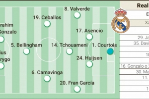 據(jù)《阿斯報(bào)》預(yù)測(cè)首發(fā)為:庫爾圖瓦;巴爾韋德、勞爾-阿森西奧、赫伊森、弗蘭-加西亞;瓊阿梅尼、卡馬文加、塞巴略斯、貝林厄姆;迪亞斯或貢薩洛、維尼修斯或羅德里戈。