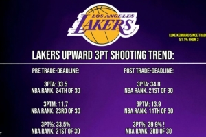 交易得到肯納德后:場(chǎng)均出手34.8次(聯(lián)盟第21),命中13.9記(第11),三分命中率39.9%(第3)