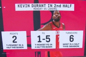 破不了夾擊!杜蘭特2助7失誤 下半場僅在垃圾時間得2分!