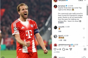 凱恩社媒曬出慶祝進(jìn)球的照片,配文:“四分之一決賽,我們來(lái)了!安聯(lián)球場(chǎng)的精彩夜晚!”