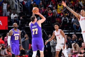 反過(guò)來(lái),盧卡被火箭夾擊,找八村一個(gè)幸運(yùn)的跳進(jìn)三分,自己一個(gè)超級(jí)三分球,然后找八村和勒布朗后門空接,從容拆解。